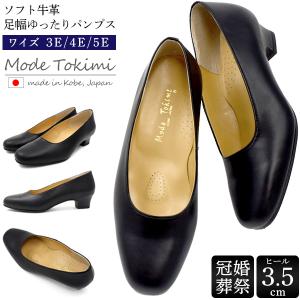 靴 女性 パンプス ソフト牛革 黒 レディース 日本製 プレーンパンプス 3.5cmヒール 本革 Mode Tokimi 歩きやすい 幅広 3E 4E 5E 神戸 21.5〜25cm 日本製
