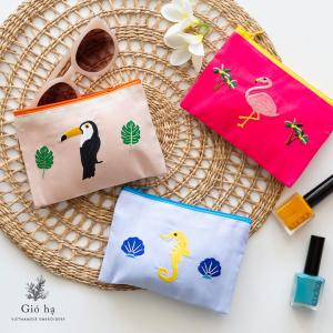 ポーチ トロピカル 南国 ベトナム 刺繍 約 W 16cm D 11cm 化粧 コスメ ジップ ケース マスク トラベル 小物 入れ かわいい 雑貨 Gio ha ジョーハ 51308