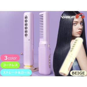 ■ヘアアイロン 充電式 コードレス ブラシアイロン ベージュ 3段階温度調節 2way 携帯 コーム ヒートブラシ レディース メンズ 送料無料