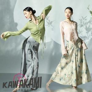 古典ダンス衣装 セットアップ 長袖トップス リボン付き 4色 ダンスパンツ ワイドパンツ キュロット 花柄 レッスン着 ボ スカーパン アシンメトリー チュー