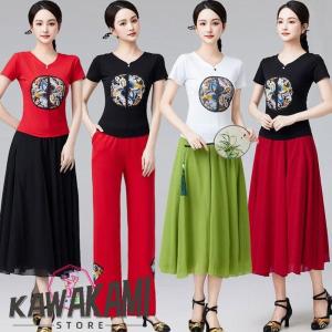 古典ダンス 衣装 レディース 上下セット 中華風 ダンス衣装 シャツ パンツ スカート 民族風ダンス衣装 刺繍 扇子踊り 社交ダンスウェア チャイナダンス 大きいサ