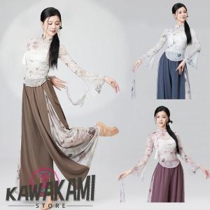レディース古典なダンス衣装 古典ダンス衣装 上下セット 花柄 古典ヨガバレエ衣装 シースルー羽織 フレア袖 ガウチョパンツ レッスン着 ワイドパンツ 民族ダンス
