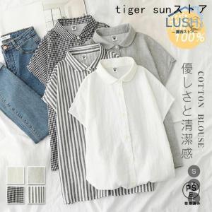 シャツ 綿100% 半袖 ブラウス Tシャツ レディース 無地 通勤 OL オフェス フリル ストライプチェックナチュラル着痩せゆったり体型カバー