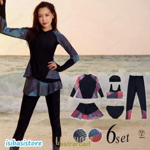 フィットネス水着 レディース 20代 30代 40代 50代 ママ水着 体型カバー 長袖 ラッシュガード レギンス 6点セット