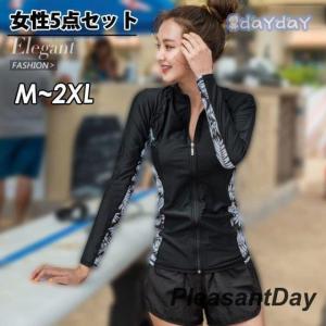 レディース水着 体型カバー 水着5点セット フィットネス水着 スイムウェア 長袖ラッシュガード 速乾運動 スポーツウエア ジム 女性用 み