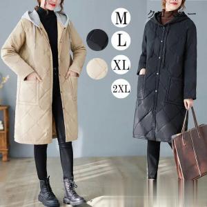 キルティングコート レディース 秋冬 ロングコート フード付き 中綿 中綿コート 前開き ポケット付き ジャケット 無地 厚手 冬物 ドッキング ふんわり 大きいサ