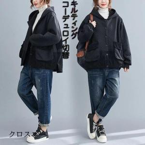 キルティングコート ショートコート 裏起毛 アウター 裏ボア フード付き 秋冬 大きいサイズ ジャケット コーデュロイコート 切替 前後差 無地 防寒 カジュアル