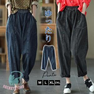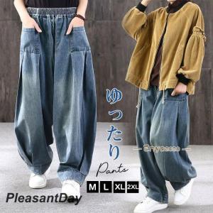 サルエルパンツ レディース デニムパンツ サーカスパンツ ウエストゴム ロングパンツ ガウチョ ワイドパンツ 体型カバー ゆったり カジュアル