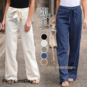 ワイドパンツ レディース リネン風 ウエストゴム 綿 ゆったり コットン 洗える 無地 体型カバー ロング丈 ナチュラル ボトムス
