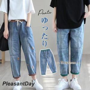 サルエルパンツ レディース デニムパンツ ダメージ サーカスパンツ ウエストゴム 普段着 ガウチョ ワイドパンツ 体型カバー ゆったり カジュアル