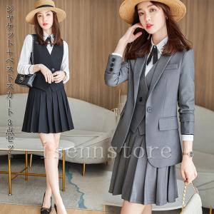 スカートスーツ レディース セットアップ 細身スタイル ビジネススーツ セレモニースーツ テーラードジャケット+ベスト+プリーツ 3点セット OL ママ 事務服