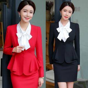 スカートスーツ レディース 事務服 長袖フリル ノーカラージャケット 女性 セレモニー フォーマル 発表会 OL通勤 就活 オフィス ビジネス 2点セット