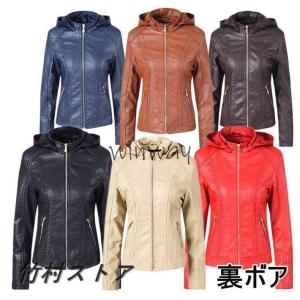 レザー レディース 秋冬ライダース 革ジャン フード付き 着痩せ フェイクレザー