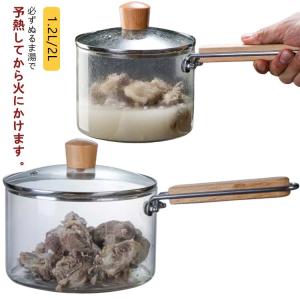 1.2L/2L ガス火対応 耐熱ガラス ミルクパン 蓋付き ソースパン ミニパン クリア 透明 万能鍋 卓上鍋 北欧風 木製ハンドル 離乳食 小鍋 小