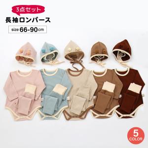 セットアップ 3点セット 長袖ロンパース ロングパンツ 長ズボン ボンネット 帽子 ベビー 赤ちゃん 子供 男の子 女の子 無地 ポンポン シンプル
