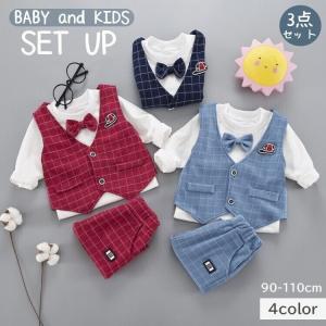 セットアップ ベスト カットソー 長ズボン 3点セット ベビー キッズ 男の子 女の子 長袖 ロングパンツ チェック柄 リボン おしゃれ