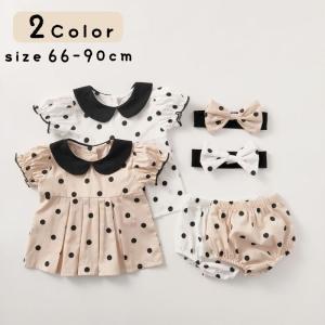 セットアップ 3点セット ベビー 赤ちゃん 子供 女の子 半袖 ワンピース パンツ ヘアバンド リボン ドット 水玉 フレア ベージュ オフホワイト