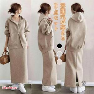 セットアップ レディース ジップアップパーカー スカート 2点セット ジャージ 上下セット ファスナージャケット+ロングスカート 無地 ゆったり ストレート 春 秋