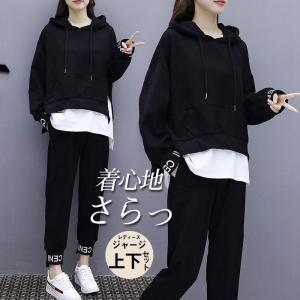 セットアップ ジャージ レディース スウェット 上下セット 長袖 春秋 重ね着風 パーカー 一部即納 長ズボン スポーツウェア 運動服 着痩せ 大きいサイズ