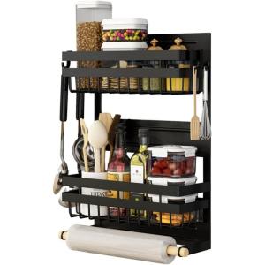 マグネット スパイスラック 3段 約W30×D11.5×H42cm 冷蔵庫サイドラック ブラック 収納 磁石ラック 穴開け不要 省スペース キッチンペーパーホルダー