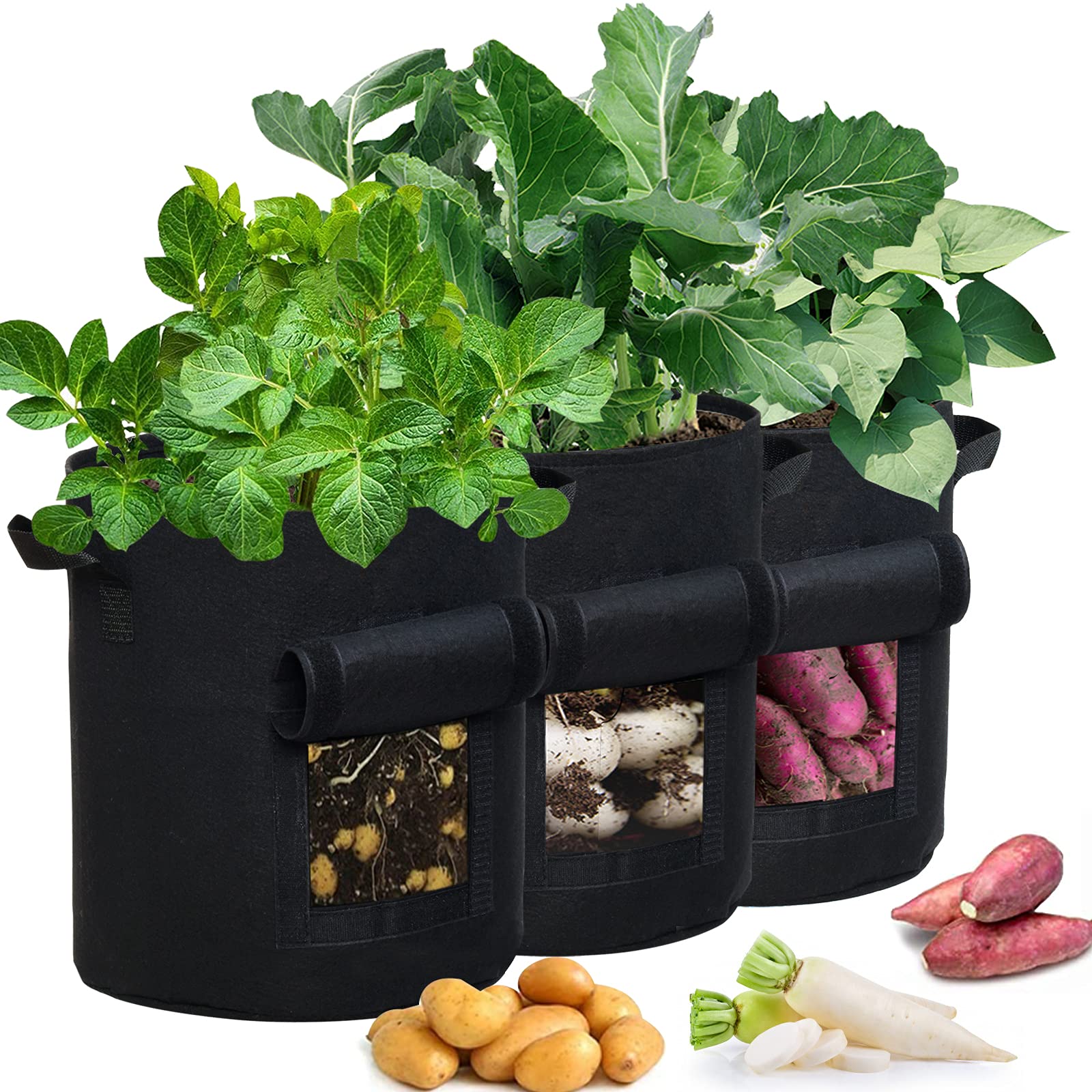 3個セット 10ガロン プランター 布鉢 栽培袋 窓がある 黒 フェルト 不織布ポット 植え袋 ガーデン 通気性 diy 園芸 植物育成 じゃがいも 野菜 大容量 JES&MEDIS (黒, 10ガロン_3個)