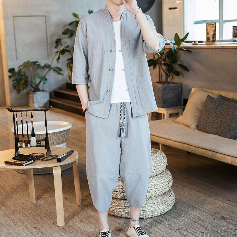 メンズ 綿麻上下セット サルエルパンツ上下セット 羽織 着物