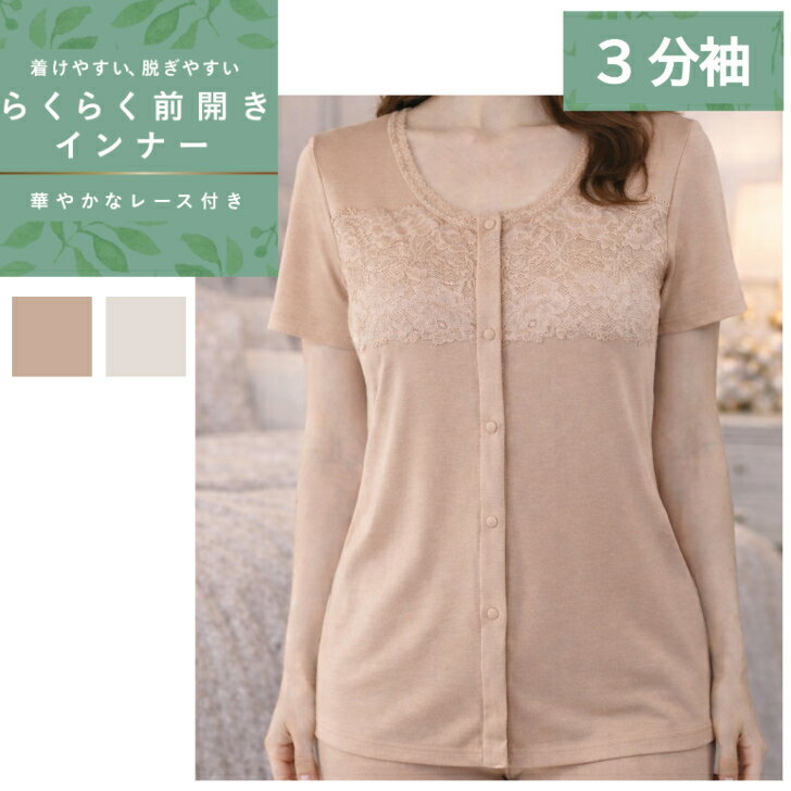 綿100% 前開き 3分袖 レディース 女性 らくらく開閉 スナップボタン ボタン 肌着 インナー 入院 診察 介護 ベージュ/ピーチ M-LL 13377