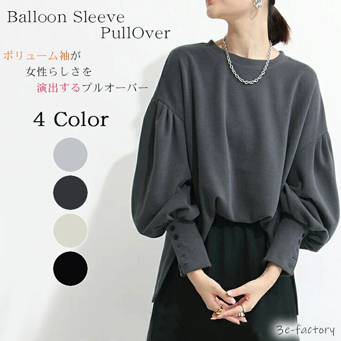 カットソー スウェット レディース トレーナー 長袖 袖ボタン ボタンスリーブ プルオーバー トップス ボリュームスリーブ バルーン袖 ラウンドネック ドロップショルダー ロングテール サイドスリット 無地 シンプル カジュアル きれいめ かわいい 大人 春 秋 冬