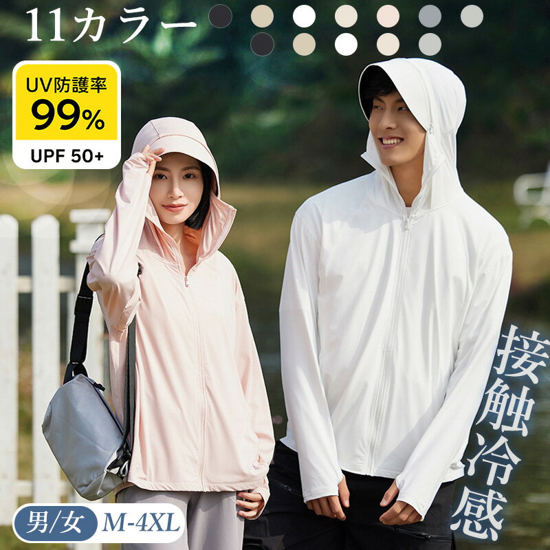 【冷感UVカットパーカー 男女兼用】接触冷感-7℃体感 長袖 指穴付き 通気メッシュ サンバイザー取外し可 大きめサイズ M〜4XL展開 ラッシュガード風 速乾 軽量 紫外線対策 男女兼用 夏用トップス カップルコーデ 通勤 旅行 スポーツ観戦
