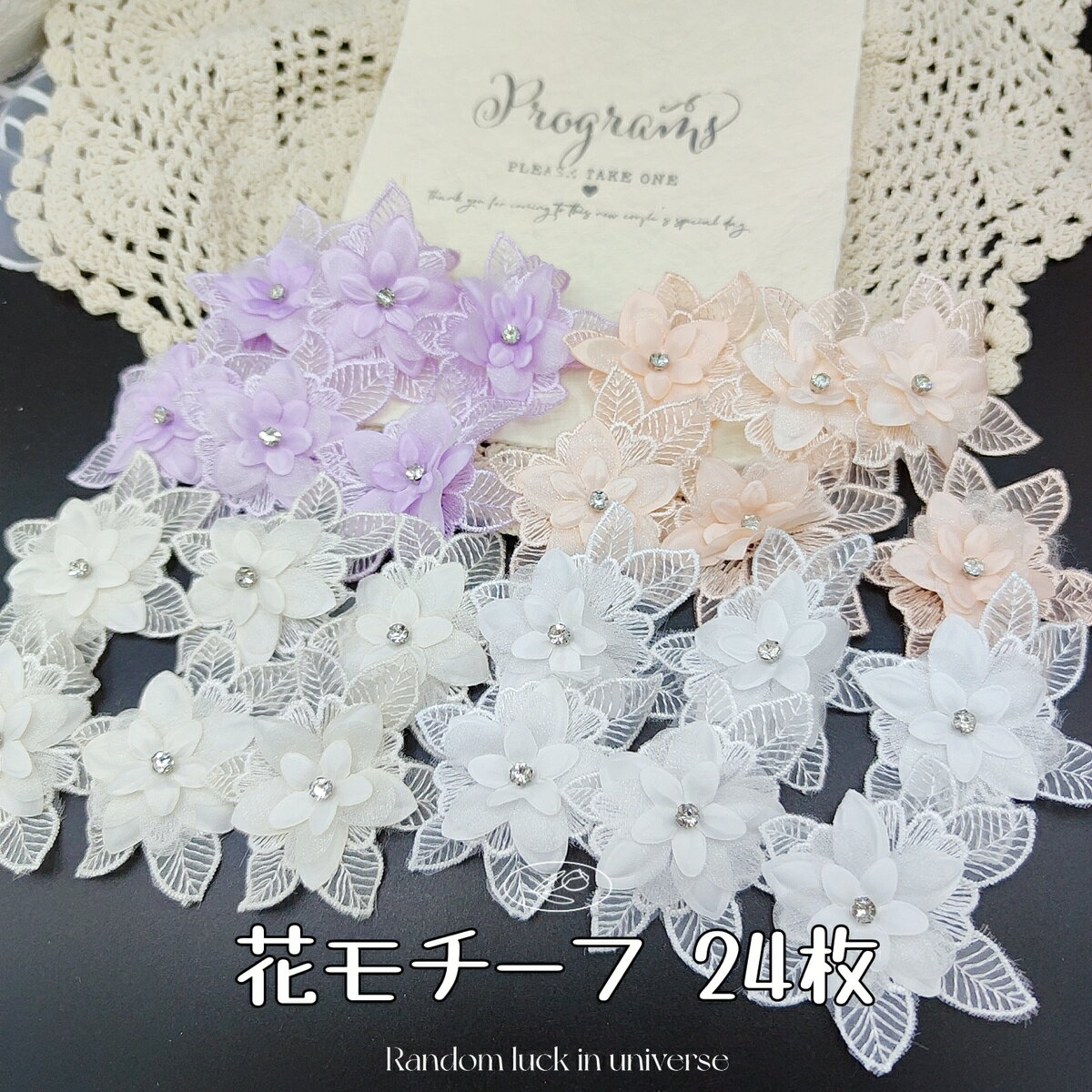 レース 花 薔薇 睡蓮 パープル4枚 素材 花 ケミカル モチーフ 刺繍 花芯