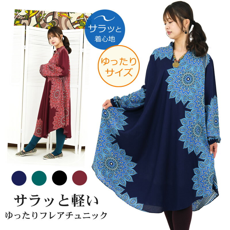 コットンプリントフレアチュニック【アジアンファッション/エスニックファッション/アジアン/エスニック/レディース/トップス/チュニック/ワンピース/ノースリーブ/フレア/Aライン】