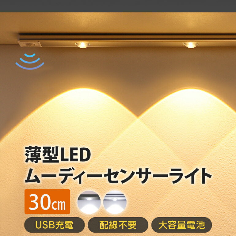 薄型 LED センサーライト ムーディー 【30cm】 充電式 人感センサーライト ledライト ledセンサーライト マグネット 工事不要 屋内 モーション 玄関 非常灯 足元灯 常夜灯 色調整可能 3モード調整 キッチン 台所 多目的灯