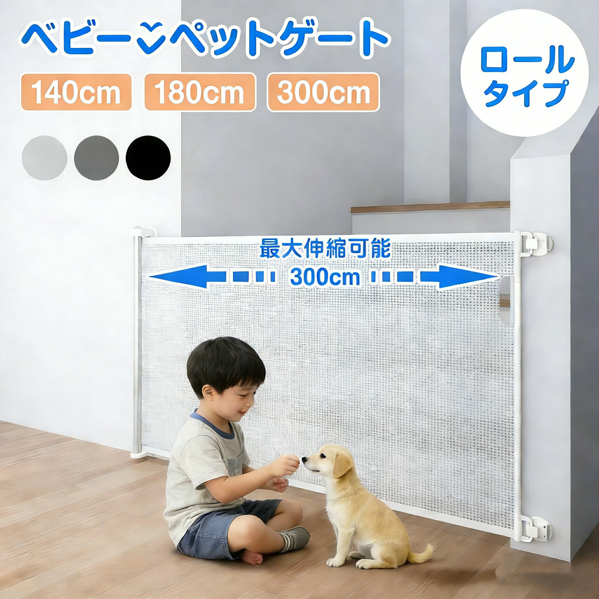 ベビーゲート ロール式 階段上対応 伸縮式 最大300cm 巻き取り式 セーフティゲート 穴あけ不要 壁保護 階段口 玄関 キッチン ペットゲート 犬 猫 子供用 簡単設置