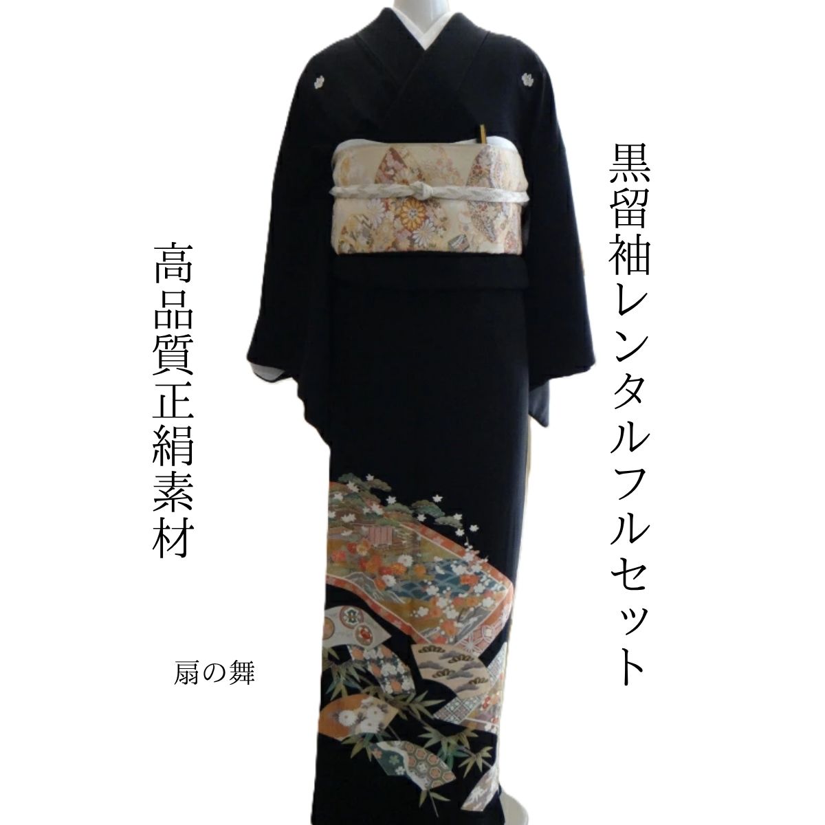 レンタル 扇の舞 結婚式 黒留袖 黒留 留袖レンタル 貸衣装留袖 フルセット 帯 草履 バック 足袋 小物 着物 結婚式お母さん 往復送料無料 身長150cm~160cm対応 高級正絹素材 お母さんだって立派な主役 おめでたい扇を沢山あしらいました 上品で華やか 人気上位争い常連