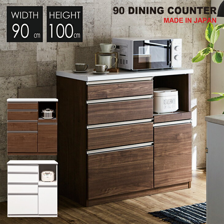 日本製 カウンター 完成品 国産 幅90 キッチンカウンター キッチン収納 レンジ台 食器カウンター ダイニングカウンター 鏡面 キッチン 収納 引出し シンプル モダン 北欧 民泊 送料無料