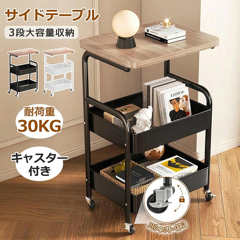 サイドテーブル キャスター付き ナイトテーブル サイドラック ベッドサイド 3段 大容量 マガジンラック オープンラック スチールテーブル スリム 収納 棚 ラック ホワイト/ブラック おしゃれ 木製 寝室 多目的 組立簡単 最大耐荷重30kg玄関
