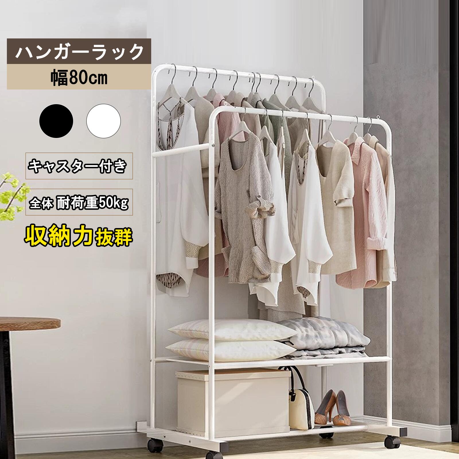 ダブルハンガーラック ハンガーラック 2段棚付き 洋服ラック パイプハンガー ラック 衣類ラック コート掛け 洋服掛け 大容量 収納ラック フック付き 衣類収納 組立簡単 360度回転キャスター付き 防サビ 防水 耐腐食性 (ホワイト, 幅80cm×奥行50cm×高さ160CM)
