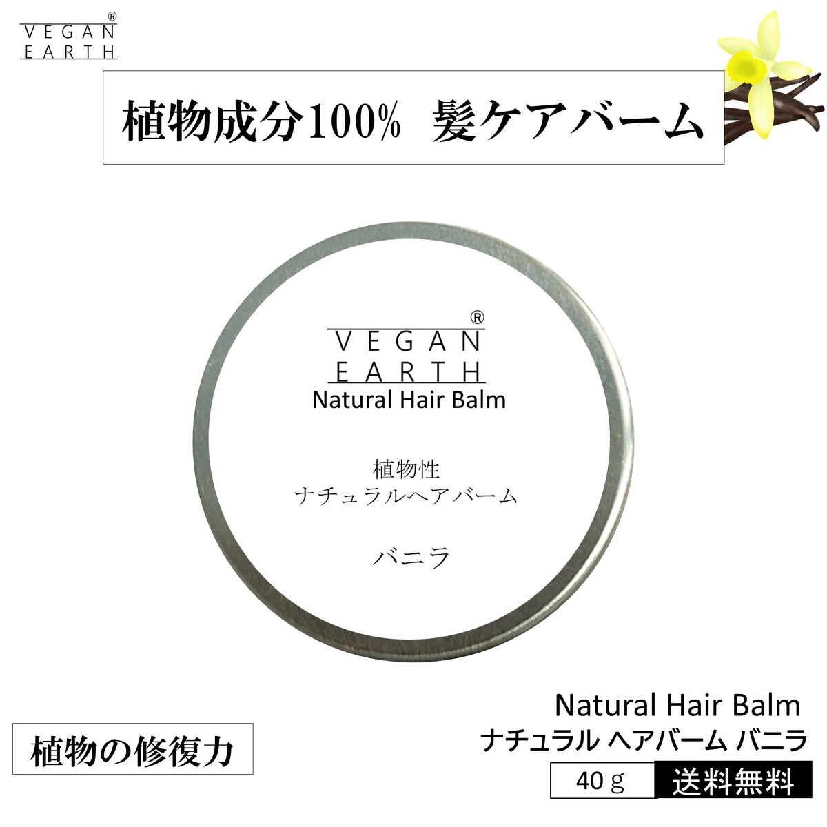 ナチュラル ヘア バーム 40g バニラの香り VEGAN EARTH 髪 優しい やさしく まとまる 天然成分 植物成分 100% 化学物質一切不使用 天然植物のソフトフレグランス ほのか 香る 薫る 心を癒す 健康な髪 すこやか