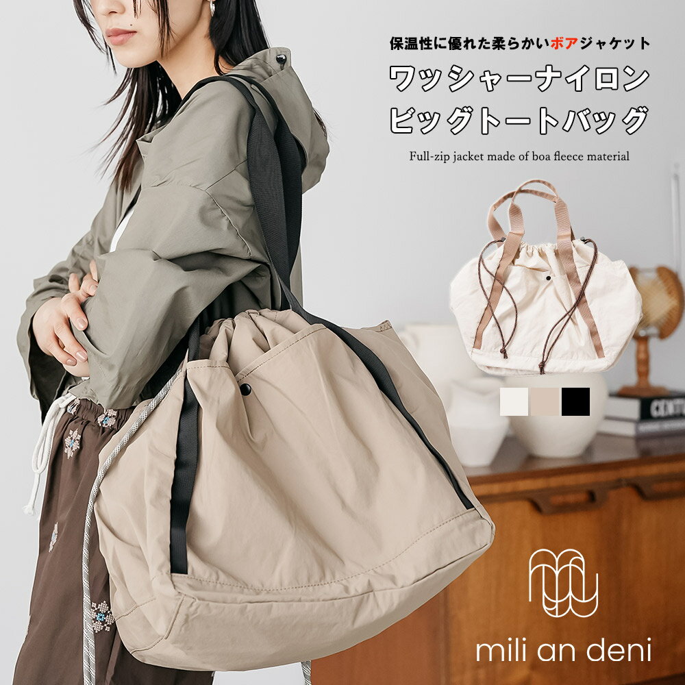【17%OFFクーポン☆】ワッシャーナイロンビッグトートバッグ ショルダーバッグ ハンドバッグ 鞄 大容量 ブラック ベージュ アイボリー A4収納可能 配色ハンドル 小物 雑貨 フリーサイズ レディース バッグ 秋 冬 春 ミリアンデニ