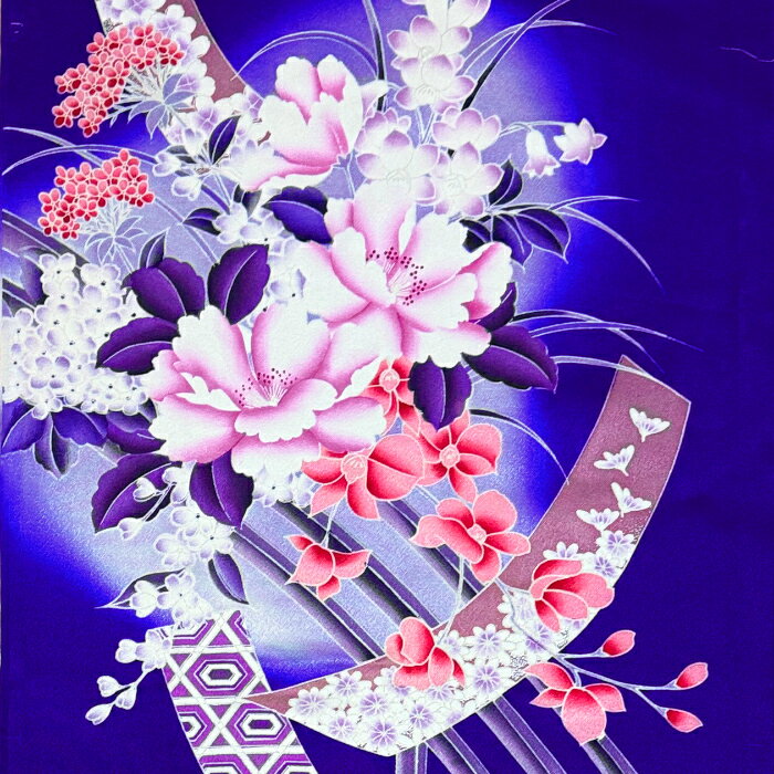 【中古】紺紫色地に豪華な牡丹や花々が綺麗な振袖着物はぎれ