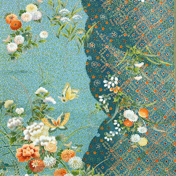 【中古】紺色地に花々や雲紋が描かれた着物はぎれ