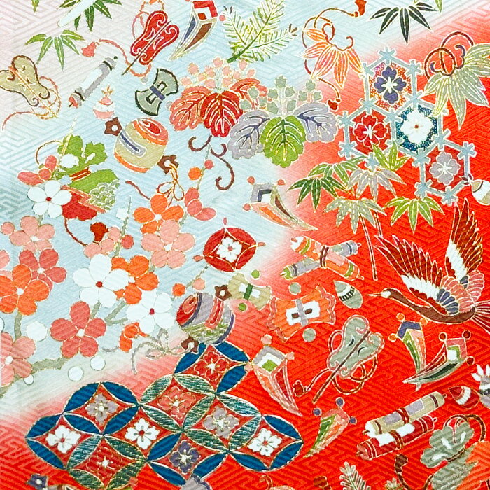【中古】朱色地に花々や帯が綺麗な金彩振袖着物はぎれ