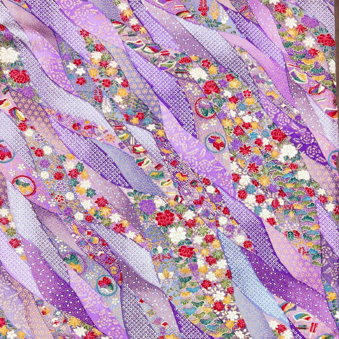 【中古】紫色の帯が重なり輝く金彩着物はぎれ