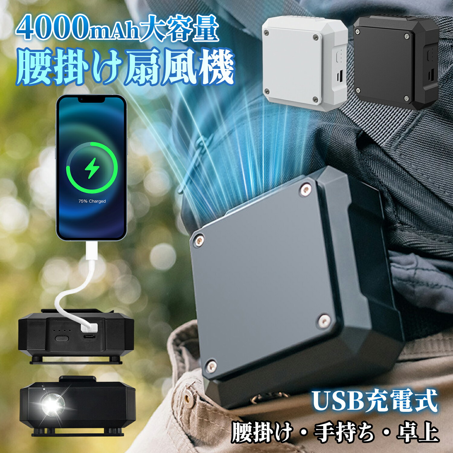 腰掛け扇風機 4000mAh大容量 扇風機・照明・モバイルバッテリー USB充電式 小型ポータブルファン 強力風量調節 アウトドア作業・農作業・工事現場対応(腰掛け・手持ち・卓上)