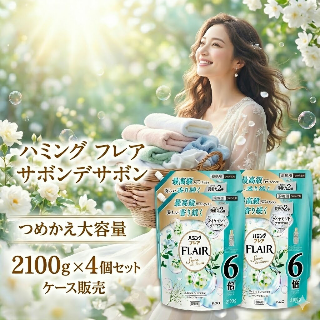 【ケース販売】ハミングフレア 柔軟剤 サボンデサボンの香り 詰替 2100g×4個大容量 6倍サイズ 花王 柔軟仕上げ剤 送料無料 まとめ買い つめかえ 詰め替え用 フレアフレグランス 最高級アロマ 香りが続く 清潔感 徳用 特大 ストック 日用品 買いまわり