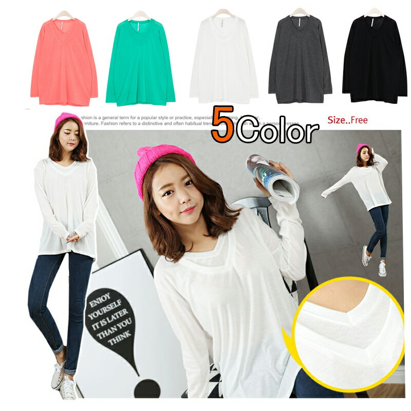ダブルVネック無地ロング丈長袖Tシャツカットソー