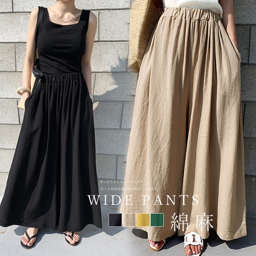韓国ファッション リネン混 ワイドパンツ レディース 薄手 春夏 スカンツ ウエストゴム ゆるシルエット 体型カバー 春服 ガウチョパンツ ボトムス パンツ デイリー カジュアル