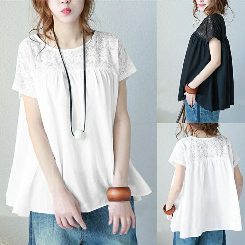 シャツ 半袖 トップス レースブラウス 上着 韓国ファッション レディース ビックサイズ 無地 Uネック おしゃれ お出かけ ブラック ホワイト S/M/L/XL/2XL