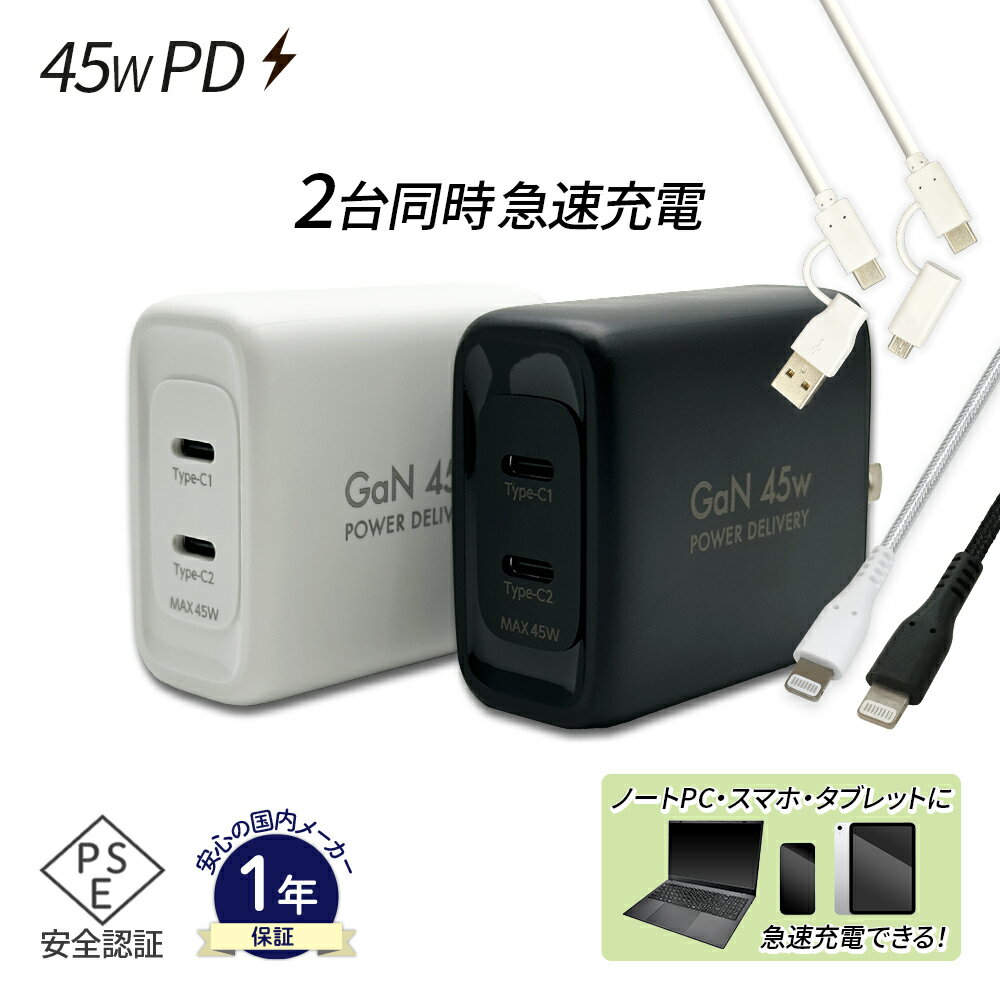 【2台同時急速充電】スマホ ノートPC タブレット AC充電器 Type-C 2口 ライトニングケーブルセット Type-C 4wayケーブルセット 月間優良ショップ 受賞 eca080749 ゆうパケット 送料無料 GaN PPS対応 ノートPC充電対応 アウトレット
