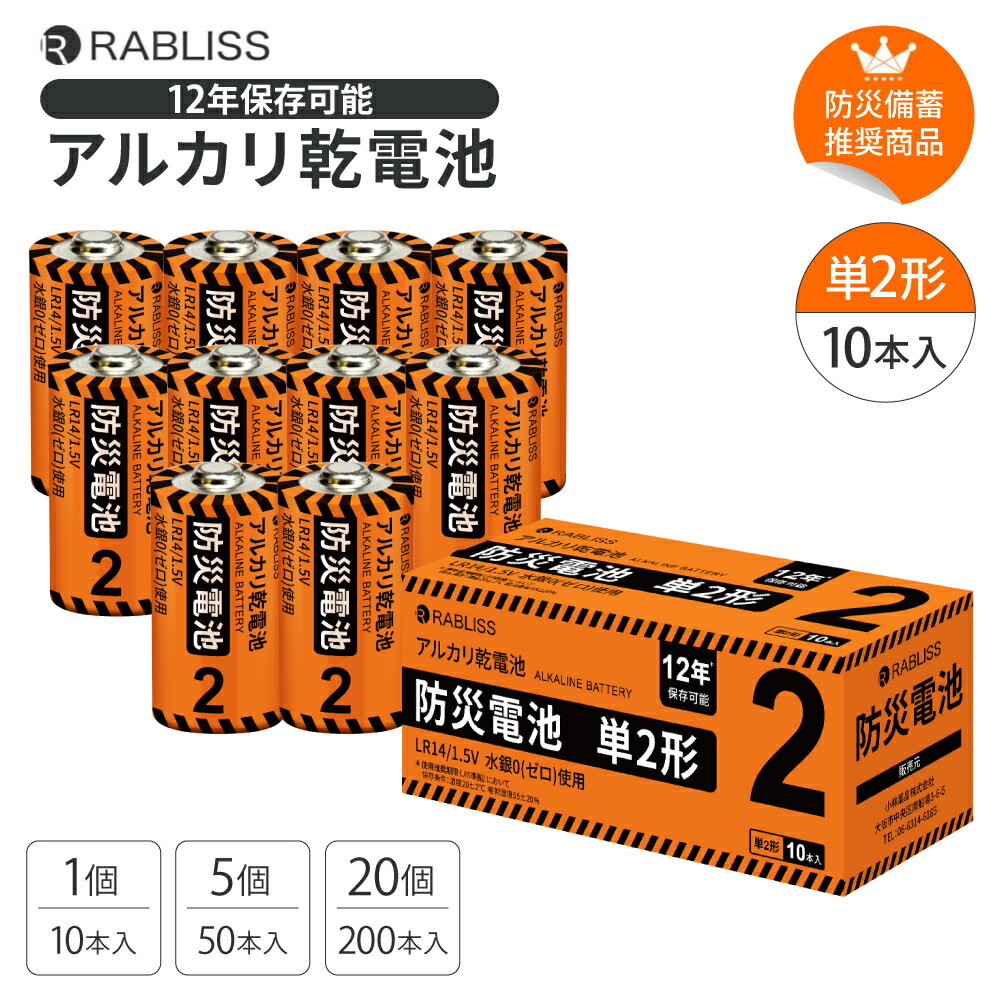 防災 乾電池 単2形 10本 50本 200本 アルカリ乾電池 単2電池 電池 12年保存 台風対策 地震対策 充電 懐中電灯 ラジオ ライト ランタン 防災グッズ 防災用品 長期保存 防災士監修 防災電池 まとめ買い 停電 KO408 RABLISS
